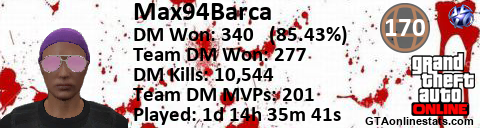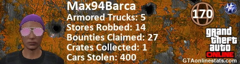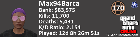 <a href="http://GTAonlinestats.com/showplayer/Max94Barca"><img src="http://GTAonlinestats.com/randomsignature/Max94Barca/sig.png" alt="Max94Barca" border="0" /></a>