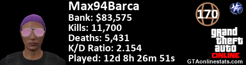 <a href="http://GTAonlinestats.com/showplayer/Max94Barca"><img src="http://GTAonlinestats.com/dmsignature/Max94Barca/sig.png" alt="Max94Barca" border="0" /></a>