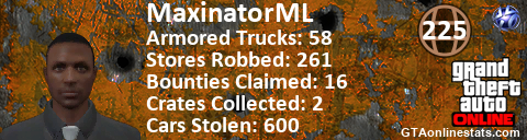 <a href="http://GTAonlinestats.com/showplayer/MaxinatorML"><img src="http://GTAonlinestats.com/randomsignature/MaxinatorML/sig.png" alt="MaxinatorML" border="0" /></a>