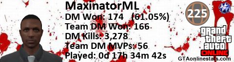 [URL=http://GTAonlinestats.com/showplayer/MaxinatorML][IMG]http://GTAonlinestats.com/dmsignature/MaxinatorML/sig.png[/IMG][/URL]