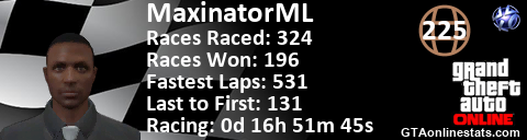 <a href="http://GTAonlinestats.com/showplayer/MaxinatorML"><img src="http://GTAonlinestats.com/racesignature/MaxinatorML/sig.png" alt="MaxinatorML" border="0" /></a>