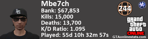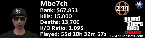 <a href="http://GTAonlinestats.com/showplayer/Mbe7ch"><img src="http://GTAonlinestats.com/randomsignature/Mbe7ch/sig.png" alt="Mbe7ch" border="0" /></a>