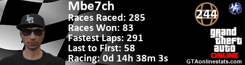 <a href="http://GTAonlinestats.com/showplayer/Mbe7ch"><img src="http://GTAonlinestats.com/racesignature/Mbe7ch/sig.png" alt="Mbe7ch" border="0" /></a>