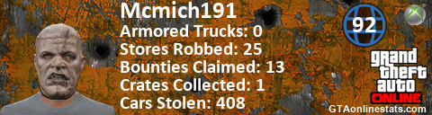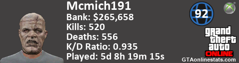 <a href="http://GTAonlinestats.com/showplayer/Mcmich191"><img src="http://GTAonlinestats.com/randomsignature/Mcmich191/sig.png" alt="Mcmich191" border="0" /></a>