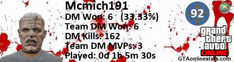 [URL=http://GTAonlinestats.com/showplayer/Mcmich191][IMG]http://GTAonlinestats.com/dmsignature/Mcmich191/sig.png[/IMG][/URL]