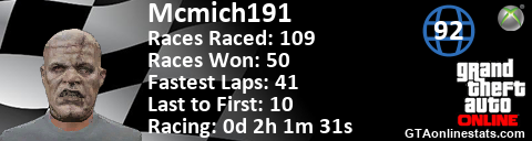 [URL=http://GTAonlinestats.com/showplayer/Mcmich191][IMG]http://GTAonlinestats.com/racesignature/Mcmich191/sig.png[/IMG][/URL]