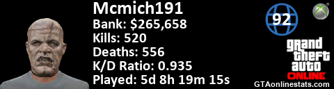 [URL=http://GTAonlinestats.com/showplayer/Mcmich191][IMG]http://GTAonlinestats.com/signature/Mcmich191/sig.png[/IMG][/URL]