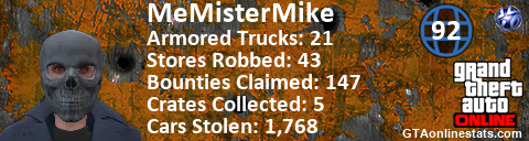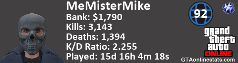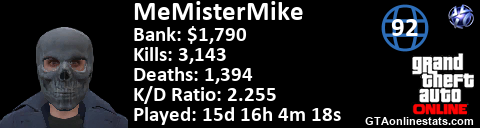 <a href="http://GTAonlinestats.com/showplayer/MeMisterMike"><img src="http://GTAonlinestats.com/randomsignature/MeMisterMike/sig.png" alt="MeMisterMike" border="0" /></a>