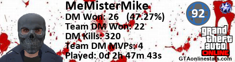 [URL=http://GTAonlinestats.com/showplayer/MeMisterMike][IMG]http://GTAonlinestats.com/signature/MeMisterMike/sig.png[/IMG][/URL]