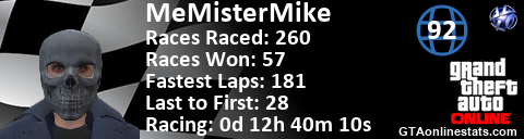 <a href="http://GTAonlinestats.com/showplayer/MeMisterMike"><img src="http://GTAonlinestats.com/racesignature/MeMisterMike/sig.png" alt="MeMisterMike" border="0" /></a>
