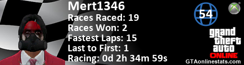 <a href="http://GTAonlinestats.com/showplayer/Mert1346"><img src="http://GTAonlinestats.com/racesignature/Mert1346/sig.png" alt="Mert1346" border="0" /></a>