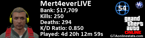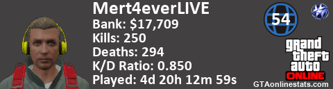 <a href="http://GTAonlinestats.com/showplayer/Mert4everLIVE"><img src="http://GTAonlinestats.com/randomsignature/Mert4everLIVE/sig.png" alt="Mert4eveRLIVE" border="0" /></a>