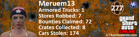 <a href="http://GTAonlinestats.com/showplayer/Meruem13"><img src="http://GTAonlinestats.com/randomsignature/Meruem13/sig.png" alt="Meruem13" border="0" /></a>