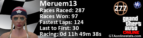<a href="http://GTAonlinestats.com/showplayer/Meruem13"><img src="http://GTAonlinestats.com/racesignature/Meruem13/sig.png" alt="Meruem13" border="0" /></a>