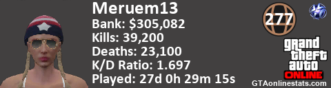 <a href="http://GTAonlinestats.com/showplayer/Meruem13"><img src="http://GTAonlinestats.com/signature/Meruem13/sig.png" alt="Meruem13" border="0" /></a>
