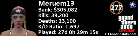 <a href="http://GTAonlinestats.com/showplayer/Meruem13"><img src="http://GTAonlinestats.com/dmsignature/Meruem13/sig.png" alt="Meruem13" border="0" /></a>