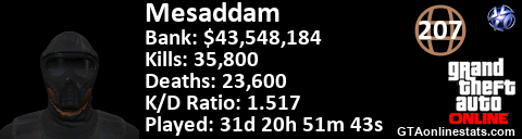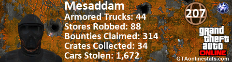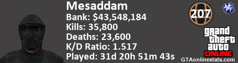 [URL=http://GTAonlinestats.com/showplayer/Mesaddam/2][IMG]http://GTAonlinestats.com/signature/Mesaddam/2/sig.png[/IMG][/URL]
