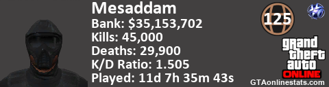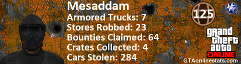 <a href="http://GTAonlinestats.com/showplayer/Mesaddam/3"><img src="http://GTAonlinestats.com/signature/Mesaddam/3/sig.png" alt="Mesaddam" border="0" /></a>