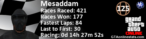 <a href="http://GTAonlinestats.com/showplayer/Mesaddam/3"><img src="http://GTAonlinestats.com/racesignature/Mesaddam/3/sig.png" alt="Mesaddam" border="0" /></a>