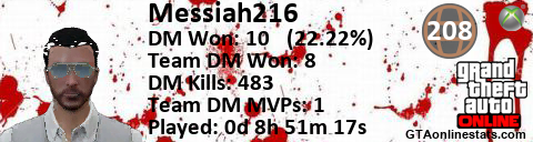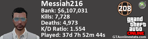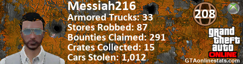 [URL=http://GTAonlinestats.com/showplayer/Messiah216/2][IMG]http://GTAonlinestats.com/signature/Messiah216/2/sig.png[/IMG][/URL]