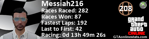 <a href="http://GTAonlinestats.com/showplayer/Messiah216/2"><img src="http://GTAonlinestats.com/racesignature/Messiah216/2/sig.png" alt="Messiah216" border="0" /></a>
