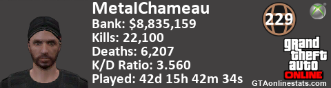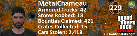 [URL=http://GTAonlinestats.com/showplayer/MetaIChameau][IMG]http://GTAonlinestats.com/crimesignature/MetaIChameau/sig.png[/IMG][/URL]