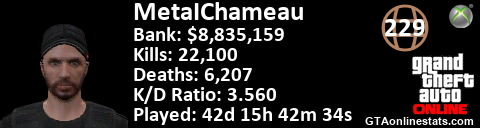 <a href="http://GTAonlinestats.com/showplayer/MetaIChameau"><img src="http://GTAonlinestats.com/signature/MetaIChameau/sig.png" alt="MetaIChameau" border="0" /></a>