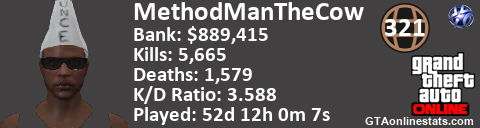<a href="http://GTAonlinestats.com/showplayer/MethodManTheCow"><img src="http://GTAonlinestats.com/signature/MethodManTheCow/sig.png" alt="MethodManTheCow" border="0" /></a>