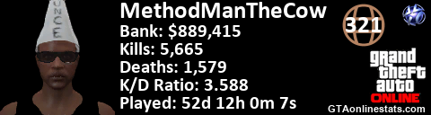 <a href="http://GTAonlinestats.com/showplayer/MethodManTheCow"><img src="http://GTAonlinestats.com/dmsignature/MethodManTheCow/sig.png" alt="MethodManTheCow" border="0" /></a>