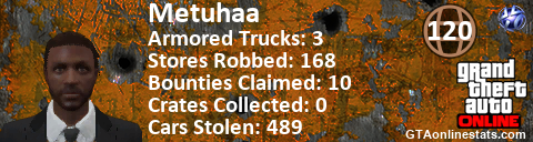 [URL=http://GTAonlinestats.com/showplayer/Metuhaa][IMG]http://GTAonlinestats.com/crimesignature/Metuhaa/sig.png[/IMG][/URL]