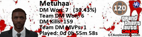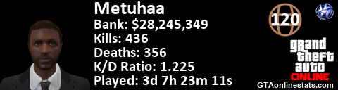 <a href="http://GTAonlinestats.com/showplayer/Metuhaa"><img src="http://GTAonlinestats.com/signature/Metuhaa/sig.png" alt="Metuhaa" border="0" /></a>