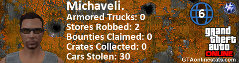 <a href="http://GTAonlinestats.com/showplayer/Michaveli."><img src="http://GTAonlinestats.com/crimesignature/Michaveli./sig.png" alt="Michaveli." border="0" /></a>