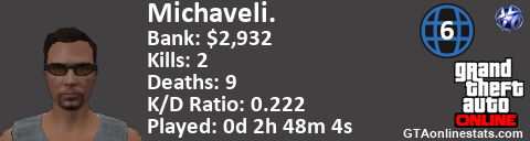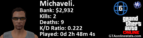 <a href="http://GTAonlinestats.com/showplayer/Michaveli."><img src="http://GTAonlinestats.com/randomsignature/Michaveli./sig.png" alt="Michaveli." border="0" /></a>
