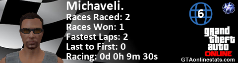 <a href="http://GTAonlinestats.com/showplayer/Michaveli."><img src="http://GTAonlinestats.com/racesignature/Michaveli./sig.png" alt="Michaveli." border="0" /></a>
