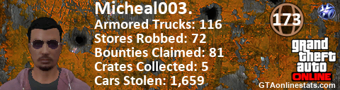 [URL=http://GTAonlinestats.com/showplayer/Micheal003.][IMG]http://GTAonlinestats.com/crimesignature/Micheal003./sig.png[/IMG][/URL]