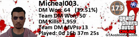 [URL=http://GTAonlinestats.com/showplayer/Micheal003.][IMG]http://GTAonlinestats.com/dmsignature/Micheal003./sig.png[/IMG][/URL]