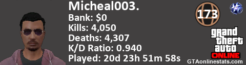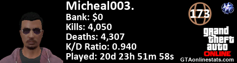 <a href="http://GTAonlinestats.com/showplayer/Micheal003."><img src="http://GTAonlinestats.com/dmsignature/Micheal003./sig.png" alt="Micheal003." border="0" /></a>