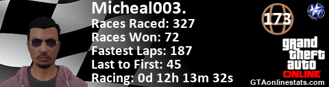 [URL=http://GTAonlinestats.com/showplayer/Micheal003.][IMG]http://GTAonlinestats.com/racesignature/Micheal003./sig.png[/IMG][/URL]