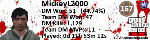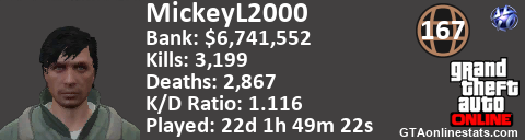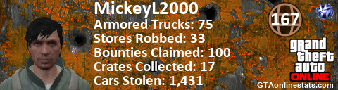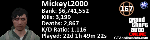 <a href="http://GTAonlinestats.com/showplayer/MickeyL2000"><img src="http://GTAonlinestats.com/signature/MickeyL2000/sig.png" alt="MickeyL2000" border="0" /></a>