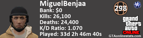 [URL=http://GTAonlinestats.com/showplayer/MiguelBenjaa][IMG]http://GTAonlinestats.com/signature/MiguelBenjaa/sig.png[/IMG][/URL]