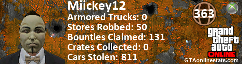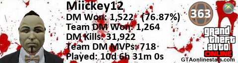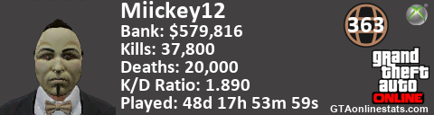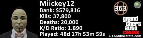 [URL=http://GTAonlinestats.com/showplayer/Miickey12][IMG]http://GTAonlinestats.com/signature/Miickey12/sig.png[/IMG][/URL]