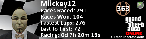 [URL=http://GTAonlinestats.com/showplayer/Miickey12][IMG]http://GTAonlinestats.com/racesignature/Miickey12/sig.png[/IMG][/URL]
