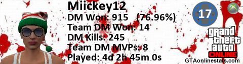 [URL=http://GTAonlinestats.com/showplayer/Miickey12/2][IMG]http://GTAonlinestats.com/dmsignature/Miickey12/2/sig.png[/IMG][/URL]
