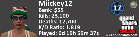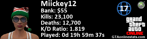 [URL=http://GTAonlinestats.com/showplayer/Miickey12/2][IMG]http://GTAonlinestats.com/signature/Miickey12/2/sig.png[/IMG][/URL]