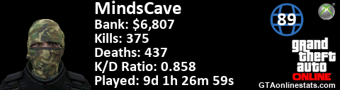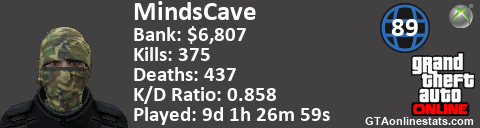 <a href="http://GTAonlinestats.com/showplayer/MindsCave"><img src="http://GTAonlinestats.com/signature/MindsCave/sig.png" alt="MindsCave" border="0" /></a>