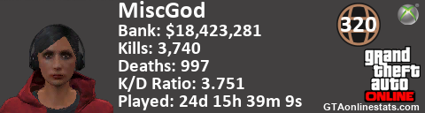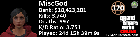 <a href="http://GTAonlinestats.com/showplayer/MiscGod"><img src="http://GTAonlinestats.com/dmsignature/MiscGod/sig.png" alt="MiscGod" border="0" /></a>