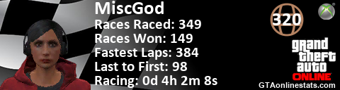[URL=http://GTAonlinestats.com/showplayer/MiscGod][IMG]http://GTAonlinestats.com/racesignature/MiscGod/sig.png[/IMG][/URL]