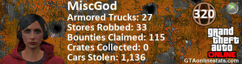 <a href="http://GTAonlinestats.com/showplayer/MiscGod"><img src="http://GTAonlinestats.com/randomsignature/MiscGod/sig.png" alt="MiscGod" border="0" /></a>