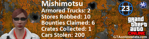 [URL=http://GTAonlinestats.com/showplayer/Mishimotsu/2][IMG]http://GTAonlinestats.com/crimesignature/Mishimotsu/2/sig.png[/IMG][/URL]