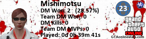 [URL=http://GTAonlinestats.com/showplayer/Mishimotsu/2][IMG]http://GTAonlinestats.com/randomsignature/Mishimotsu/2/sig.png[/IMG][/URL]